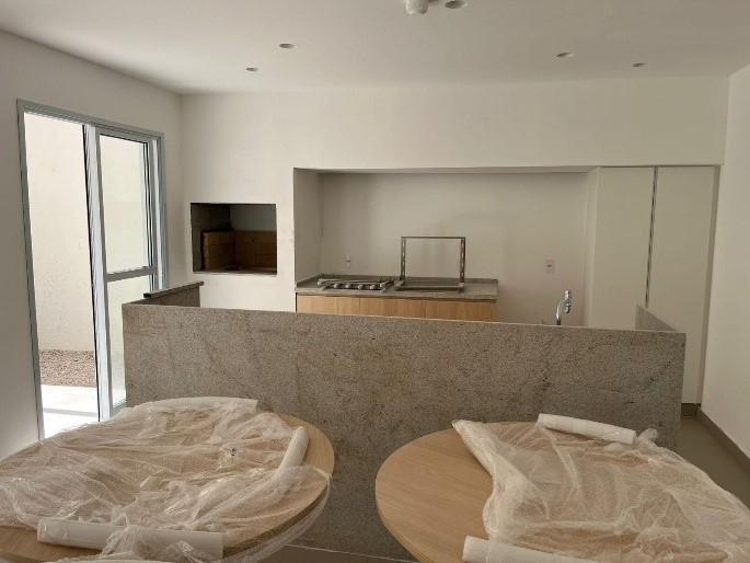 Salão de festas com churrasqueira e estar descoberto